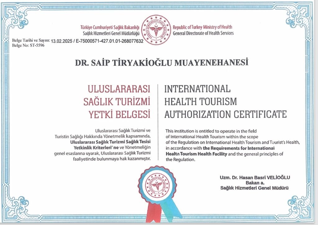 Tesisimiz, Uluslararası Sağlık Turizmi ve Turistin Sağlığı Hakkında Yönetmelik kapsamında, Uluslararası Sağlık Turizmi Sağlık Tesisi Yetkinlik Kriterleri’ne ve Yönetmeliğin genel esaslarına uyarak, Uluslararası Sağlık Turizmi faaliyetinde bulunmaya hak kazanmıştır.